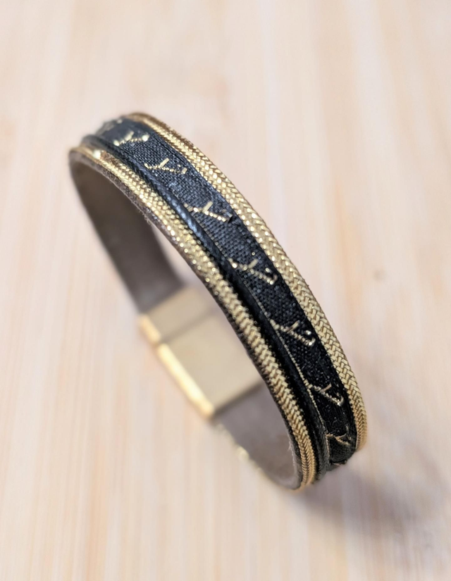 Bracelet en simili cuir beige agrémenté d un galon noir avec broderies dorées et fil noir et bordures dorées