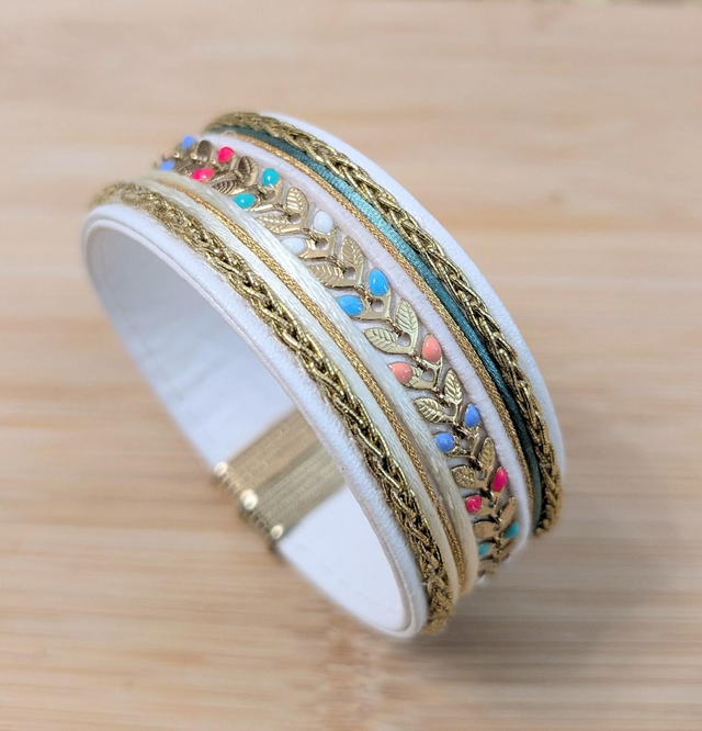 Bracelet en simili cuir blanc agrémenté de cordelettes blanches et bleus turquoise avec un décor metalique multicolor.