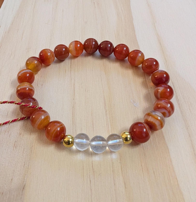 Bracelet en pierre naturelle du Botswana rouge de 8 mm avec 3 pierre de cristal de roche de 6mm ornemente de deux perles en laiton doré