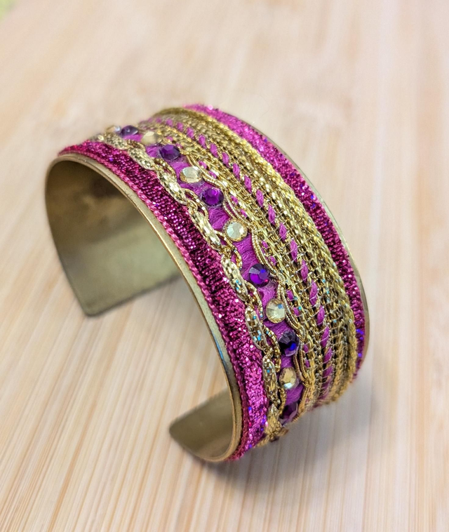 Bracelet en laiton recouvert de passementerie indienne rose et or