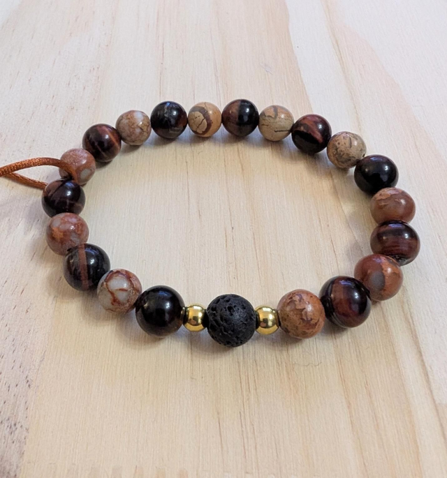 Bracelet en pierre naturelle de Jaspe royal d oeil de taureau 8 mm avec comme pierre centrale une pierre de lave 8 mm ornemente de deux petites perles dorées en laiton