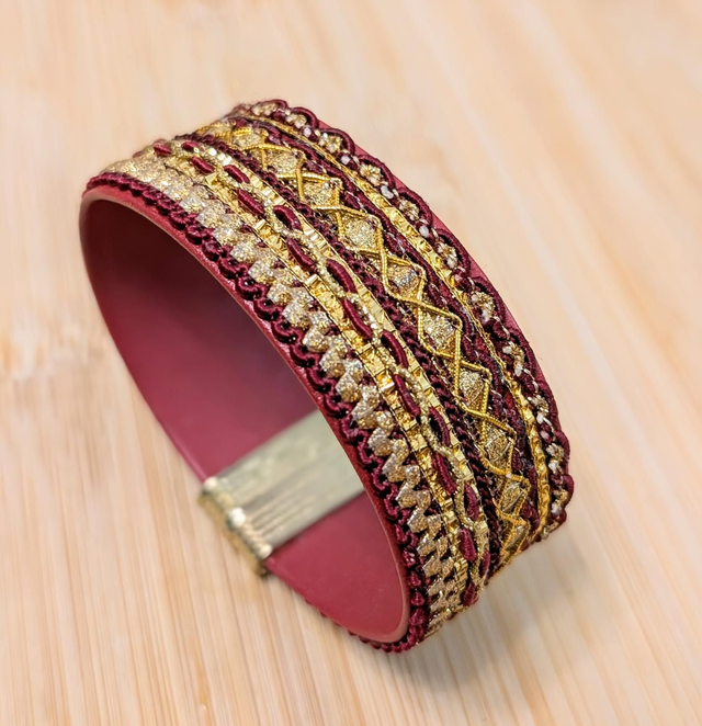 Bracelet en simili cuir Rouge agrémenté de passementerie indienne rouge et dorée